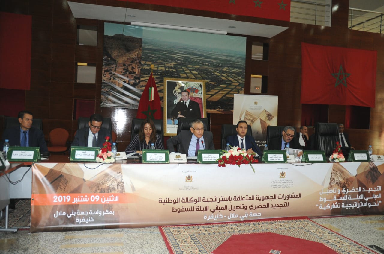 أشرف السيد والي جهة بني ملال -خنيفرة على ترأس أشغال لقاء المشاورات الجهوية حول الدراسة المتعلقة باستراتيجية تدخل الوكالة الوطنية وتأهيل المباني الآيلة للسقوط في أفق سنة 2030، يوم أمس الإثنين 09 شتنبر 2019، وذلك بحضور السادة عمال الأقاليم بالجهة، والسيد رئيس مجلس الجهة، والسيدة مديرة الوكالة الوطنية للتجديد الحضري وتأهيل المباني الآيلة للسقوط، ورؤساء المجالس الإقليمية والمجالس المنتخبة ، ورؤساء المصالح اللاممركزة بالجهة، وممثلو الهيئات المهنية والجامعات والخبراء، وممثلو المجتمع المدني ووسائل الإعلام.