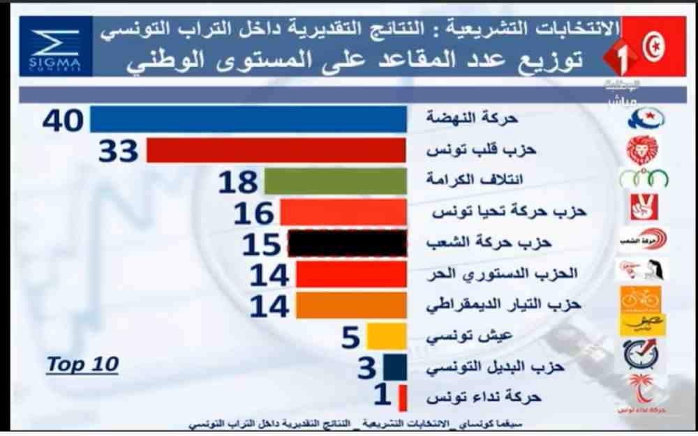 وبحسب النتائج التقريبية التي أعلنت عنها “سيغما كونساي”، وهو مكتب متخصص في استطلاعات الرأي السياسية، فإن حركة النهضة بإحرازها على هذه النسبة، ستحصل على 38 من أصل 217 مقعدا في مجلس نواب الشعب المقبل (البرلمان)، ويليها حزب “قلب تونس”، الذي سيحصل على 33 مقعدا.