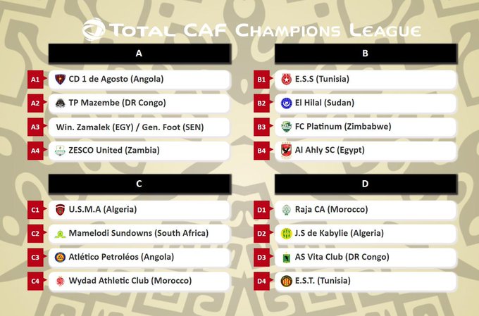 المجموعة الأولى: أول أغسطس الأنغولي، مازيمبي الكونغولي، الزمالك المصري أو جينيراسيون فوت السنغالي، زيسكو الزامبي.