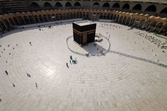 وانتشرت على شبكات التواصل الاجتماعي صور وتسجيلات أظهرت الكعبة في وسط صحن المسجد فوق أرضية بيضاء وحيدة تحيط بها حواجز بلاستيكية، إلى جانب مجموعة من عناصر الأمن وعمال النظافة.