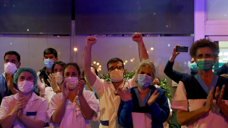 من المستشفى المؤقت في العاصمة الإسبانية مدريد، علا تصفيق الأطباء والممرضات احتفاء بأول مريض يخرج متعافيا من عدوى الفيروس التاجي “كورونا” .