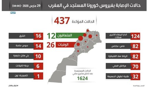فيروس كورونا : تسجيل 35 حالة مؤكدة جديدة “حتى الساعة الثامنة من يومه الأحد: ليرتفع العدد الإجمالي إلى 437 حالة