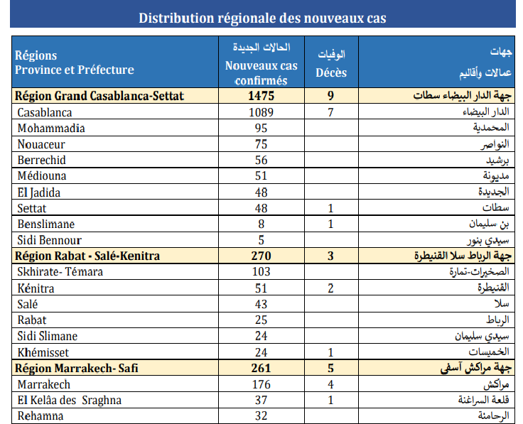 وتتوزع الحالات المسجلة خلال الـ24 ساعة الأخيرة عبر جهات المملكة، بين كل من جهات الدار البيضاء-سطات (1475 حالة)، والرباط-سلا- القنيطرة (270)، ومراكش-آسفي (261)، وسوس-ماسة (146)، وبني ملال-خنيفرة (112). كما تم تسجيل 101 حالة إصابة بجهة درعة-تافيلالت، و99 بجهة طنجة-تطوان-الحسيمة، و88 بجهة الشرق، إلى جانب تسجيل 42 حالة إصابة بجهة فاس-مكناس، و28 بجهة الداخلة-وادي الذهب، و24 بجهة العيون-الساقية الحمراء،و17 جالة بجهة كلميم-واد نون.