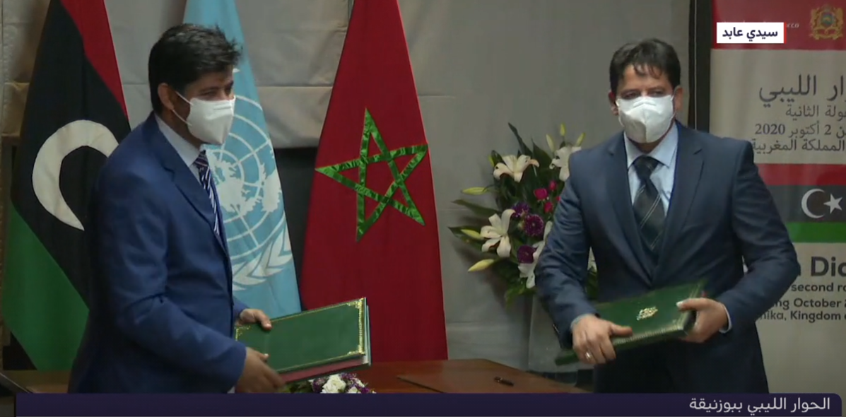 أكد وفدا المجلس الأعلى للدولة ومجلس النواب الليبي المشاركان في الجولة الثانية لجلسات الحوار الليبي في بوزنيقة، اليوم الثلاثاء، أن هذه الجولة “توجت بالتوصل إلى تفاهمات شاملة حول ضوابط وآليات ومعايير اختيار شاغلي المناصب القيادية للمؤسسات السيادية المنصوص عليها في المادة 15 من الاتفاق السياسي الليبي الموقع في دجنبر 2015 بالصخيرات”.