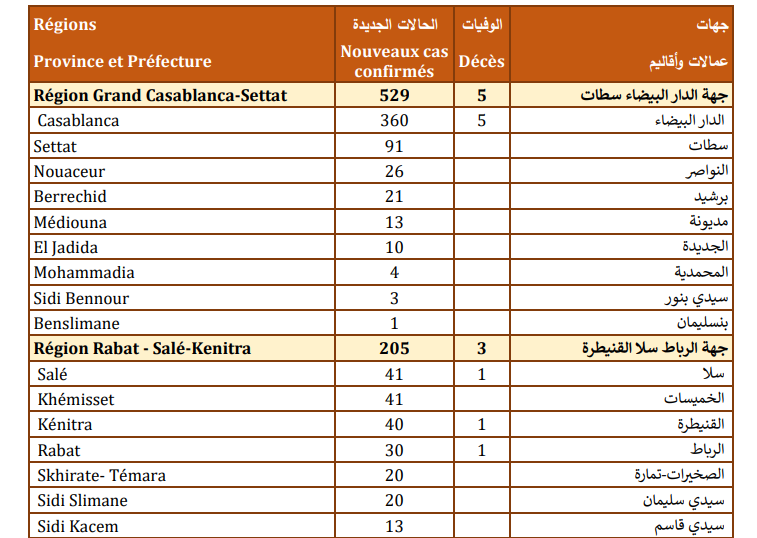 وتتوزع الحالات المسجلة خلال الـ24 ساعة الأخيرة عبر جهات المملكة، بين كل من جهات الدار البيضاء-سطات (529)، والرباط-سلا- القنيطرة (205)، ومراكش آسفي (171). كما تم تسجيل 121 حالة بجهة الشرق، و107 حالة بجهة بني ملال خنيفرة، و95 حالة بجهة طنجة تطوان الحسيمة، و57 حالة بجهة فاس مكناس، و37 حالة بجهة سوس ماسة، و19 حالة بجهة درعة تافيلالت، و16 حالة بجهة الداخلة وادي الذهب. أما توزيع حالات الوفيات، فيظهر، حسب نشرة الوزارة، تسجيل خمس حالات بكل من جهات الدار البيضاء-سطات (كلها بالدار البيضاء)، ومراكش آسفي، وفاس مكناس، وأربع حالات بجهة طنجة تطوان الحسيمة، وثلاث حالات بكل من جهة الرباط سلا القنيطرة، وجهة الشرق، وحالتان بكل من جهات بني ملال خنيفرة، وسوس ماسة، ودرعة تافيلالت.