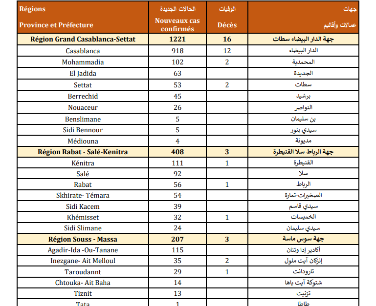 وبخصوص حالات الوفاة، فقد أشارت نشرة الوزارة إلى أنه تم تسجيل 16 حالة بجهة الدار البيضاء-سطات، و6 حالات بكل من جهة الشرق وجهة بني ملال-خنيفرة وجهة مراكش-آسفي وجهة فاس-مكناس، و3 حالات بكل من جهة الرباط-سلا-القنيطرة وجهة سوس-ماسة، وحالتان بجهة طنجة-تطوان-الحسيمة، وحالة وفاة واحدة بكل من جهة درعة-تافيلالت والعيون-الساقية الحمراء.