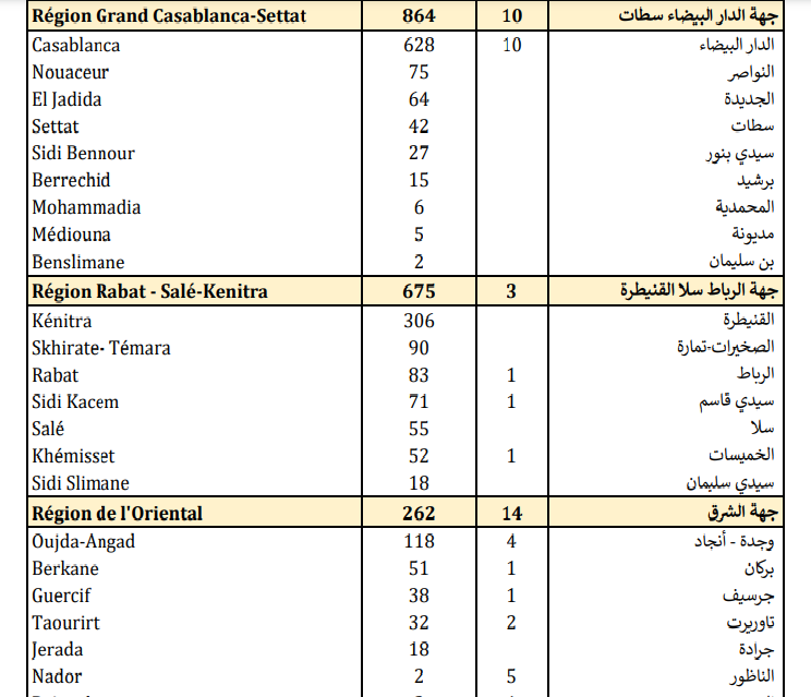 وبخصوص حالات الوفاة، أشارت نشرة الوزارة إلى أنه تم تسجيل 14 حالة بجهة الشرق، و10 حالات بجهة الدار البيضاء-سطات،و9 حالات بجهة سوس-ماسة، و8 حالات بكل من جهة طنجة-تطوان-الحسيمة وجهة مراكش-آسفي، و4 حالات بكل من جهة فاس-مكناس، وبني ملال-اخنيفرة، و3 حالات بكل من جهة الرباط-سلا-القنيطرة وجهة درعة-تافيلالت، وحالة واحدة بجهة العيون-الساقية الحمراء.