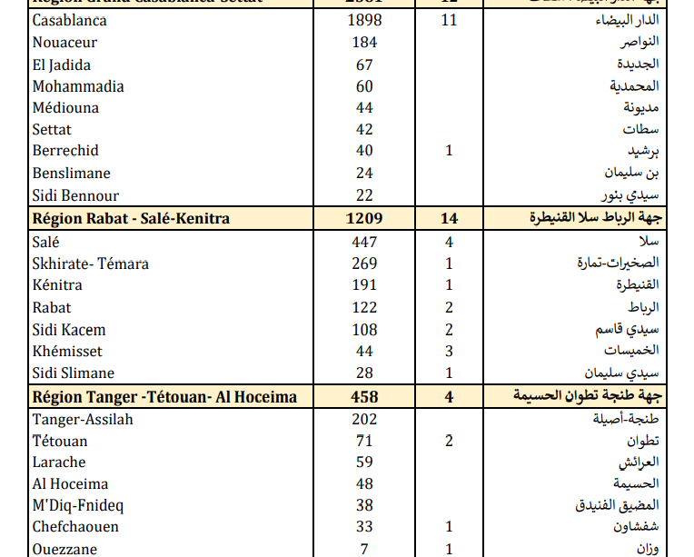 كما تم تسجيل 143 حالة بجهة درعة تافيلالت، و139حالة إصابة بجهة الشرق، و133 بجهة بني ملال خنيفرة، و109 حالات بجهة العيون-الساقية الحمراء، و100 حالة بجهة فاس-مكناس، و79 حالة بجهة كلميم-واد نون، و37 حالة بجهة الداخلة وادي الذهب.