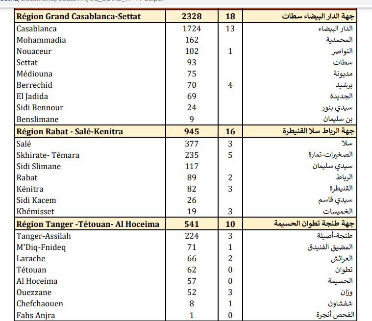 وبخصوص حالات الوفاة، أشارت نشرة الوزارة إلى أنه تم تسجيل 18 بجهة الدار البيضاء-سطات، و16 حالة بجهة الرباط-سلا-القنيطرة، و13 حالة بجهة الشرق، و10 حالات بجهة طنجة-تطوان-الحسيمة،و7 حالات بجهة مراكش- آسفي،و5 حالات بجهة فاس-مكناس، و4 حالات بجهة بني ملال-خنيفرة، و3 حالات بكل من جهة سوس-ماسة ودهة درعة-تافيلالت،وحالتين بجهة كلميم-واد نون، وحالة واحدة بجهة الداخلة-وادي الذهب.
