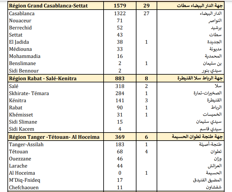 كما تم تسجيل 197 حالة بجهة سوس-ماسة، و88 بجهة درعة-تافيلالت، و84 بجهة العيون-الساقية الحمراء، و82 بجهة بني ملال-خنيفرة، و53 بجهة فاس-مكناس، و35 حالة بجهة الداخلة-وادي الذهب.