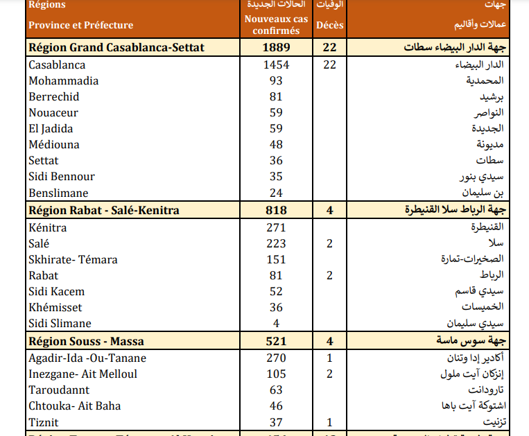وبخصوص حالات الوفاة، أشارت نشرة الوزارة إلى أنه تم تسجيل 22 حالة بجهة الدار البيضاء-سطات، و12 بجهة طنجة تطوان الحسيمة، و8 بجهة فاس مكناس، و6 بكل من جهة مراكش آسفي وجهة الشرق، و4 بكل من جهة الرباط سلا القنيطرة وجهة سوس ماسة وجهة بني ملال خنيفرة، و3 بجهة درعة تافيلالت، وحالة واحدة بجهة كلميم واد نون.