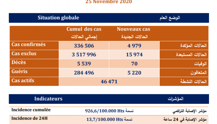 وبحسب النشرة، فقد أصبح مؤشر الإصابة التراكمي بالمغرب يناهز 926.6 إصابة لكل مائة ألف نسمة، بمؤشر إصابة يبلغ 13.7 لكل مائة ألف نسمة خلال الـ24 ساعة المنصرمة، مع استثناء 15 ألف و974 حالة من كونها مصابة بالمرض، ليرتفع إجمالي الحالات المستبعدة إلى ثلاثة ملايين و517 ألف و996، فيما يبلغ مجموع الحالات النشطة التي تتلقى العلاج حاليا 46 ألفا و471 حالة. وبلغ عدد الحالات الخطيرة أو الحرجة الجديدة الموجودة حاليا بأقسام الإنعاش والعناية المركزة، والمسجلة خلال الـ24 ساعة الأخيرة، 119 حالة، ليصل العدد الإجمالي لهذه الحالات إلى 1023 حالة، 97 حالة منها تحت التنفس الاصطناعي الاختراقي، فيما يبلغ إجمالي الحالات التي توجد تحت التنفس الاصطناعي غير الاختراقي 463 حالة.