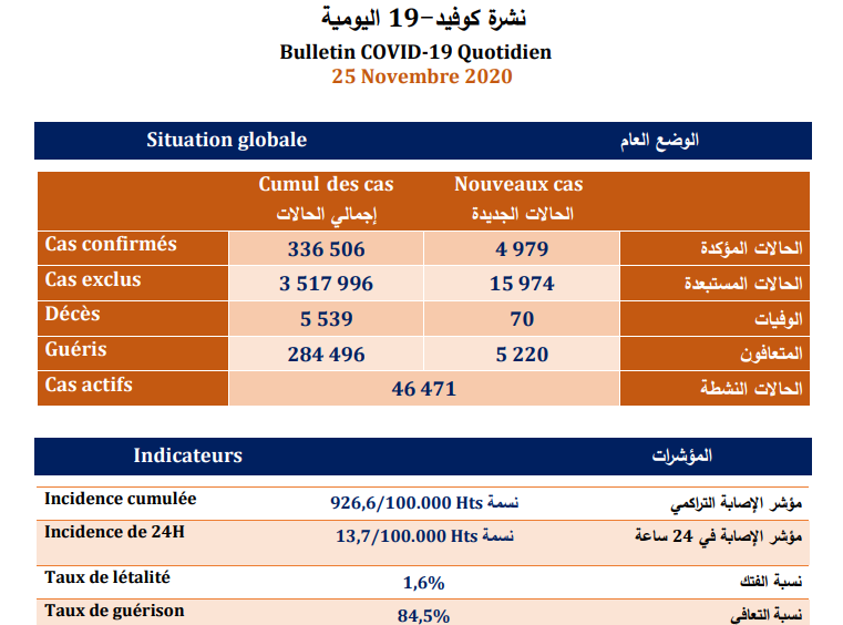 وأوضحت الوزارة، في النشرة اليومية لنتائج الرصد الوبائي لـ(كوفيد-19)، أن الحصيلة الجديدة رفعت العدد الإجمالي لحالات الإصابة المؤكدة بالمملكة إلى 336 ألف و506 حالة منذ الإعلان عن أول حالة في 2 مارس الماضي، ومجموع حالات الشفاء التام إلى 284 ألف و496 حالة، بنسبة تعاف تبلغ 5، 84 في المائة، فيما ارتفع عدد الوفيات إلى 5539 حالة، لتستقر نسبة الفتك عند 1,6 في المائة.