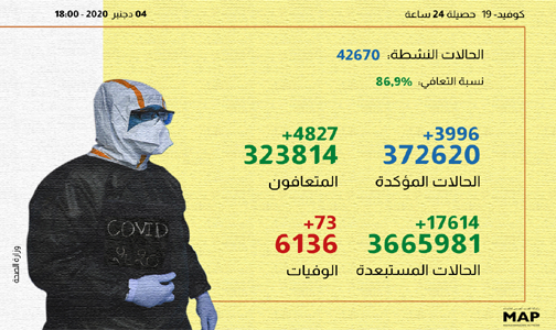 (كوفيد-19): تسجيل 73 حالة وفاة و 3996 إصابة جديدة و 4827 حالة شفاء خلال الـ24 ساعة الماضية