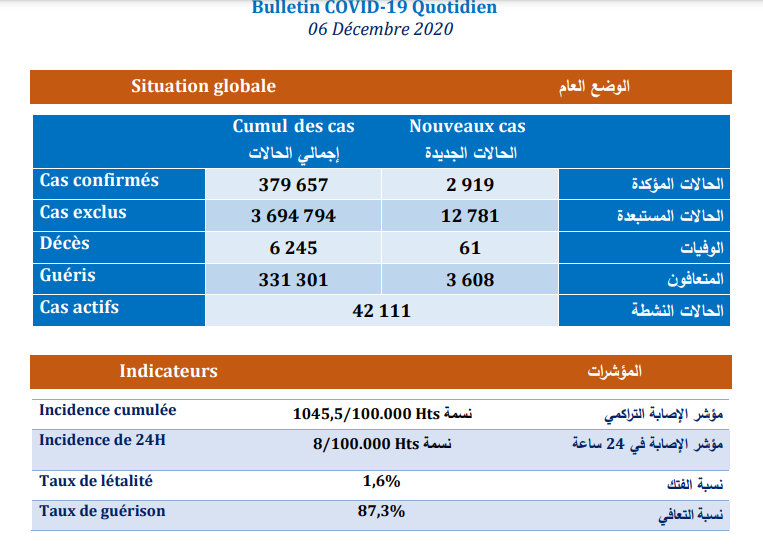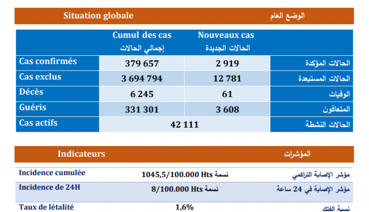 وبحسب النشرة، فقد أصبح مؤشر الإصابة التراكمي بالمغرب 1045.5 إصابة لكل مائة ألف نسمة، بمؤشر إصابة يبلغ 8 لكل مائة ألف نسمة خلال الـ24 ساعة المنصرمة، مع استثناء 12 ألف و781 حالة من كونها مصابة بالمرض، ليرتفع إجمالي الحالات المستبعدة إلى ثلاثة ملايين و694 ألف و794 حالة، فيما يبلغ مجموع الحالات النشطة التي تتلقى العلاج حاليا 42 ألفا و111 حالة.