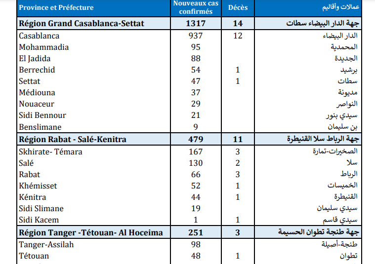 وتتوزع حالات الإصابة المسجلة خلال الـ24 ساعة الأخيرة عبر جهات المملكة، بين كل من جهة الدار البيضاء-سطات بـ 1317 حالة، وجهة الرباط-سلا-القنيطرة (479)، وجهة طنجة-تطوان-الحسيمة (251)، وجهة سوس ماسة (209)، وجهة مراكش-آسفي (190)، وجهة الشرق (148)، وجهة كلميم واد نون (98)، وجهة بني ملال خنيفرة (69)، وجهة فاس مكناس (62)، وجهة العيون الساقية الحمراء (40)، وجهة الداخلة وادي الذهب (7).