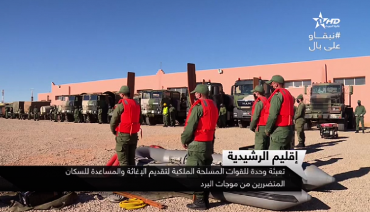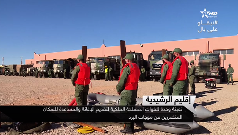 وجندت القوات المسلحة الملكية، وتحسبا لموجة البرد، المصحوبة بتساقطات كثيفة من الثلوج في العديد من المناطق الجبلية للمملكة، مختلف مكوناتها البرية والجوية والطبية قصد تقديم الإغاثة والمساعدة، إذا لزم الأمر، للسكان الذين قد يتأثرون بهذه الأحوال الجوية السيئة بتعاون مع السلطات المحلية، وذلك تنفيذا للتعليمات السامية لصاحب الجلالة الملك محمد السادس نصره الله، القائد الأعلى ورئيس أركان الحرب العامة للقوات المسلحة الملكية.