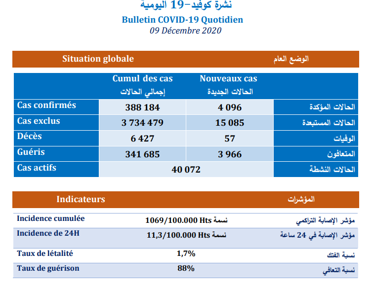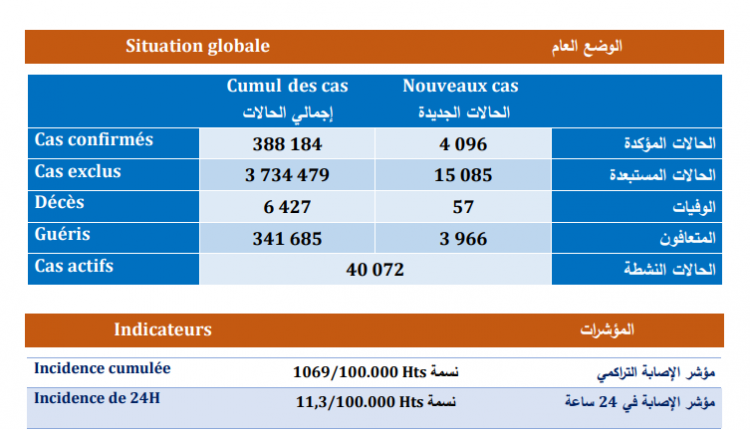 وبحسب النشرة، فقد أصبح مؤشر الإصابة التراكمي بالمغرب 1069 إصابة لكل مائة ألف نسمة، بمؤشر إصابة يبلغ 11.3 لكل مائة ألف نسمة خلال الـ24 ساعة المنصرمة، مع استثناء 15 ألفا و85 حالة من كونها مصابة بالمرض، ليرتفع إجمالي الحالات المستبعدة إلى ثلاثة ملايين 734 ألفا و479 حالة، فيما يبلغ مجموع الحالات النشطة التي تتلقى العلاج حاليا 40 ألفا و72 حالة.