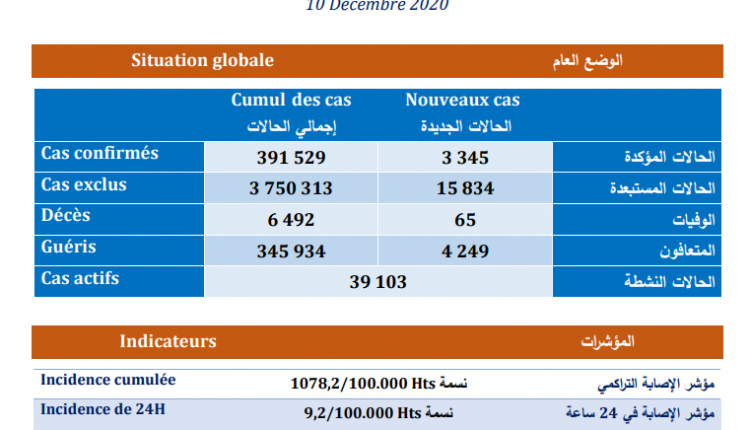 وبلغ عدد الحالات الخطيرة أو الحرجة الجديدة بأقسام الإنعاش والعناية المركزة المسجلة خلال الـ24 ساعة الأخيرة، 150 حالة، ليصل العدد الإجمالي لهذه الحالات إلى 965 حالة، 87 منها تحت التنفس الاصطناعي الاختراقي، و552 تحت التنفس الاصطناعي غير الاختراقي.