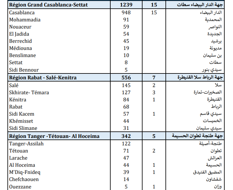 وتتوزع حالات الإصابة المسجلة خلال الـ24 ساعة الأخيرة عبر جهات المملكة، بين كل من جهات الدار البيضاء-سطات بـ1239 حالة، والرباط-سلا-القنيطرة (556)، وطنجة-تطوان-الحسيمة (342)، وسوس ماسة (286)، ومراكش-آسفي (208)، ودرعة-تافيلالت (85)، إلى جانب تسجيل 79 حالة بجهة العيون الساقية الحمراء، و69 بجهة فاس مكناس، و68 بجهة الشرق، و47 حالة بجهة بني ملال- خنيفرة، و39 بجهة كلميم واد نون، و15 حالة بجهة الداخلة وادي الذهب.