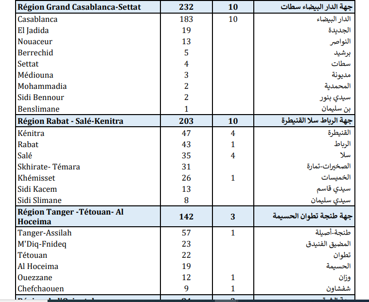 أما الوفيات فتتوزع بين كل من جهات الدار البيضاء-سطات (10 حالة)، وجهة الرباط سلا القنيطرة (10)، وجهة فاس مكناس (6)، وجهة مراكش آسفي (5)، وجهة بني ملال خنيفرة (4)، وجهة طنجة-تطوان-الحسيمة (3)، وجهة الشرق (3)، وجهة سوس-ماسة (1)، وجهة كلميم واد نون (1).