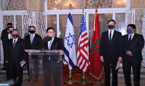 وذكر السيد بوريطة بالمكاسب الكبرى التي حققها المغرب بفضل القيادة المتبصرة لصاحب الجلالة الملك محمد السادس، وكذا باستقبال جلالته للوفد رفيع المستوى الأمريكي – الإسرائيلي “والذي يعتبر التجسيد الأول للاتصال الهاتفي بين صاحب الجلالة وفخامة الرئيس الأمريكي”.