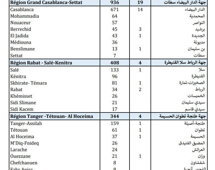 أما الوفيات فتتوزع بين كل من جهات الدار البيضاء-سطات (19 حالة)، و(4) بكل من جهة الرباط-سلا -القنيطرة وجهة طنجة-تطوان-الحسيمة، و(3) بجهة سوس-ماسة، وحالة واحدة بكل من جهة مراكش-آسفي وجهة الشرق، و(5) بكل من جهة فاس-مكناس وجهة بني ملال-خنيفرة، و (2) بجهة درعة-تافيلالت.