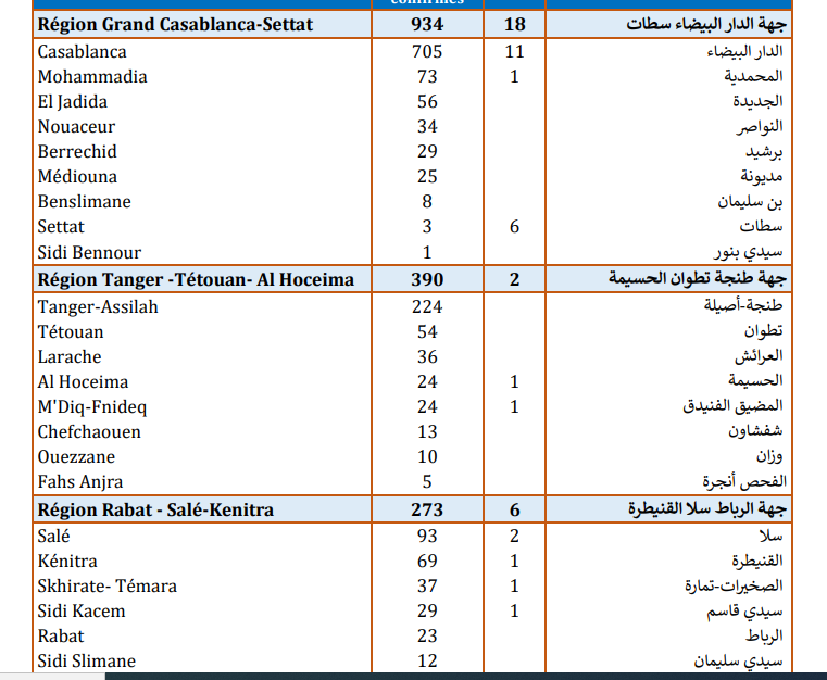 وتتوزع حالات الإصابة المسجلة خلال الـ24 ساعة الأخيرة عبر جهات المملكة بين كل من جهات الدار البيضاء-سطات ب934 حالة، وطنجة-تطوان-الحسيمة (390)، والرباط-سلا-القنيطرة (273)، وسوس-ماسة (201)، ومراكش-آسفي (185)، وجهة الشرق (142)، والعيون الساقية الحمراء (73)، وفاس-مكناس (73)، ودرعة-تافيلالت (53)، وبني ملال خنيفرة (25)، وكلميم-واد نون (19)، والداخلة-وادي الذهب (حالة واحدة).