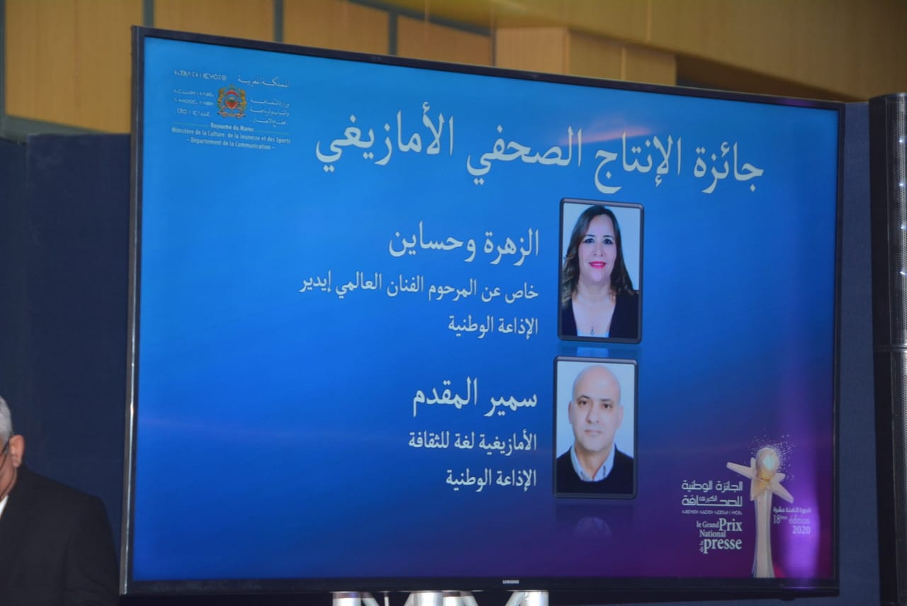 وفي صنف جائزة الإنتاج الصحفي الأمازيغي، عادت الجائزة مناصفة إلى الصحفيين بالقناة الأمازيغية (الشركة الوطنية للإذاعة والتلفزة)، الزهرة وحساين عن عمل خاص حول المرحوم الفنان العالمي إيدير، وسمير المقدم عن عمله “الأمازيغية لغة للتقاضي”.
