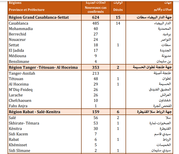 وتتوزع حالات الإصابة المسجلة خلال الـ24 ساعة الأخيرة عبر جهات المملكة بين كل من جهات الدار البيضاء-سطات (624) حالة، وطنجة-تطوان-الحسيمة (353)، والرباط-سلا-القنيطرة (159)، ومراكش-آسفي (148)، وسوس-ماسة (110)،وجهة الشرق (79)، وفاس-مكناس (46)، وبني ملال-خنيفرة (43)، ودرعة-تافيلالت (31) ،وكلميم-واد نون (22)، والعيون الساقية الحمراء (18)، والداخلة-وادي الذهب (9).
