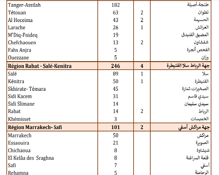 أما الوفيات، فتتوزع على جهات طنجة-تطوان-الحسيمة (7)، وبني ملال-خنيفرة (5)، والدار البيضاء-سطات (4)، والرباط-سلا-القنيطرة (4)، ومراكش-آسفي (2)، وفاس-مكناس (2)، ودرعة-تافيلالت (2)، وجهة الشرق (1).
