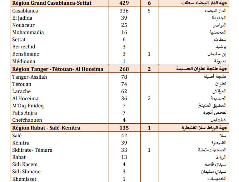 أما الوفيات، فتتوزع على جهات الدار البيضاء-سطات (6)، وبني ملال-خنيفرة (4)، والشرق (2)، وطنجة-تطوان-الحسيمة (2)، ومراكش-آسفي (2)، وسوس-ماسة (2)، والعيون-الساقية الحمراء (2)، وفاس-مكناس (1)، ودرعة تافيلالت (1)، والرباط-سلا-القنيطرة (1).