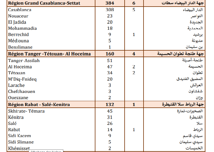 وتتوزع حالات الإصابة المسجلة خلال الـ24 ساعة الأخيرة عبر جهات المملكة بين كل من جهات الدار البيضاء-سطات (384)، وطنجة-تطوان-الحسيمة (160)، والرباط-سلا-القنيطرة (132)، وسوس-ماسة (90)، والشرق (43)، ومراكش- آسفي (38)، ودرعة-تافيلالت (21)، وفاس-مكناس (20)، والداخلة-وادي الذهب (13)، والعيون-الساقية الحمراء (12)، وكلميم-واد نون (6)، وبني ملال-خنيفرة (6).