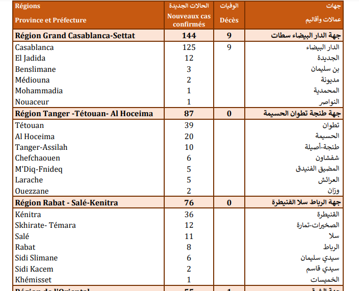 وتتوزع حالات الإصابة المسجلة خلال الـ24 ساعة الأخيرة عبر جهات المملكة بين كل من جهات الدار البيضاء-سطات (144)، وطنجة-تطوان-الحسيمة (87)، والرباط-سلا-القنيطرة (76)، والشرق (55)، وسوس-ماسة (44)، ومراكش آسفي (22)، والعيون الساقية الحمراء (14)، وفاس مكناس (7)، والداخلة وادي الذهب (5)، وكلميم واد نون (5)، ودرعة تافيلالت (4)، وبني ملال خنيفرة (3).
