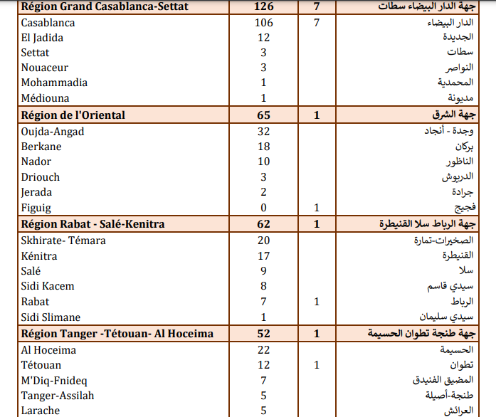 وتتوزع حالات الإصابة المسجلة خلال الـ24 ساعة الأخيرة عبر جهات المملكة بين كل من جهات الدار البيضاء-سطات (126)، والشرق (65 حالة) و الرباط سلا القنيطرة (62 حالة) و طنجة-تطوان-الحسيمة (52)، وسوس-ماسة (32)، ومراكش آسفي (20)، والعيون الساقية الحمراء (10)، والداخلة وادي الذهب (8)، و5 حالات بجهتي درعة تافيلالت وفاس مكناس و كلميم واد نون ( 3حالات)، وبني ملال خنيفرة(حالة واحدة) .