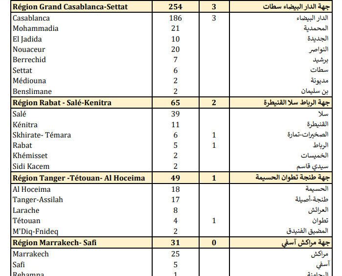وتتوزع حالات الإصابة المسجلة خلال الـ24 ساعة الأخيرة عبر جهات المملكة بين كل من جهات الدار البيضاء-سطات (254)، والرباط سلا القنيطرة (65)، وطنجة تطوان الحسيمة (49)، ومراكش آسفي (31)، والشرق (30)، ودرعة تافيلالت (16)، وسوس-ماسة (11)، وبني ملال خنيفرة (7)،والعيون-الساقية الحمراء (6)، والداخلة وادي الذهب (5)، و حالة واحدة بكل من جهة فاس مكناس وكجهة لميم واد نون.