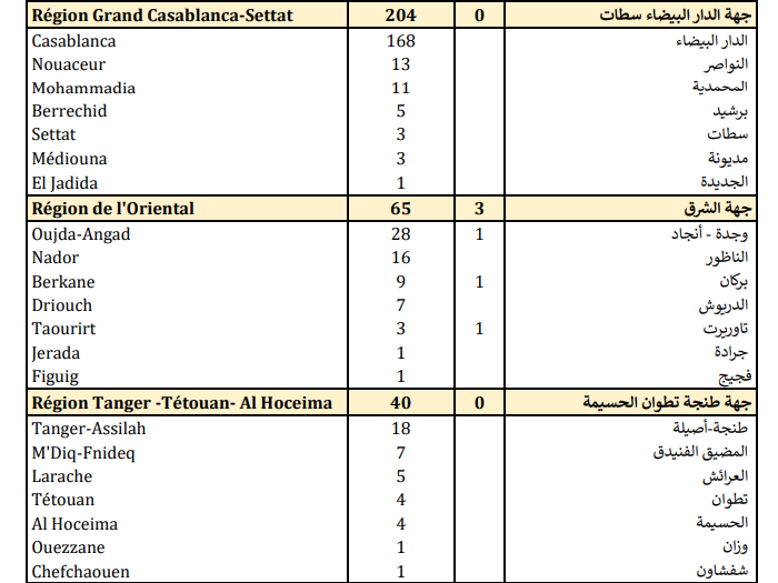 وتتوزع حالات الإصابة المسجلة خلال الـ24 ساعة الأخيرة عبر جهات المملكة بين الدار البيضاء-سطات (204)، والشرق (65)، وطنجة-تطوان-الحسيمة (40)، والرباط-سلا-القنيطرة ( 27)، ومراكش-آسفي (16)، وسوس ماسة (11)، والداخلة-وادي الذهب (7)، ودرعة-تافيلالت (6)، وفاس-مكناس (5)، وبني ملال-اخنيفرة (3)، والعيون-الساقية الحمراء (2).