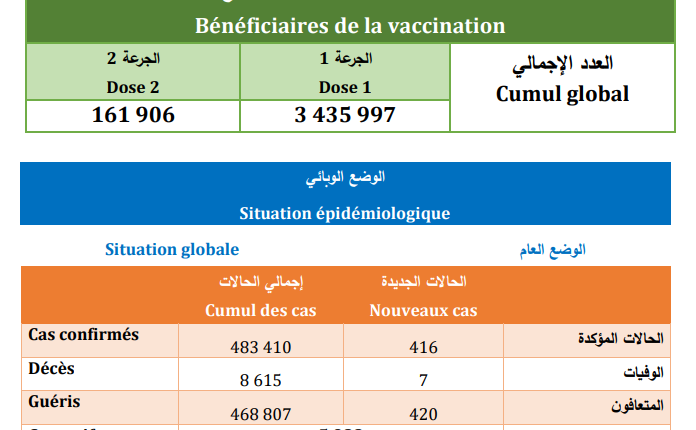 أعلنت وزارة الصحة ، اليوم السبت ، عن تسجيل 416 إصابة جديدة بفيروس كورونا المستجد و420 حالة شفاء، وسبع حالات وفاة خلال الـ24 ساعة الماضية، فيما بلغ عدد من اسفادوا من التلقيح 3 ملايين و435 ألف و997 شخصا (الجرعة الأولى).