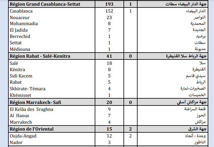 وبخصوص حالات الوفاة المسجلة فتتوزع على كل من جهة الشرق (2)، وجهة الدار البيضاء-سطات (1)، وجهة طنجة-تطوان-الحسيمة (1)، وجهة بني ملال-اخنيفرة (1).