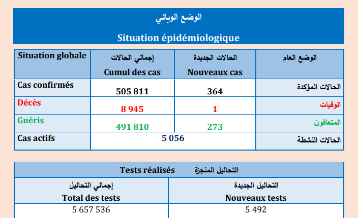 وسجلت حالة الوفاة الوحيدة خلال الأربع وعشرين ساعة الماضية بجهة الدار البيضاء-سطات. وبحسب النشرة، فقد أصبح مؤشر الإصابة التراكمي بالمغرب يبلغ 8، 1390 إصابة لكل مائة ألف نسمة، بمؤشر إصابة يبلغ 1 لكل مائة ألف نسمة خلال الـ24 ساعة المنصرمة، فيما يصل مجموع الحالات النشطة التي تتلقى العلاج حاليا إلى 5056 حالة.