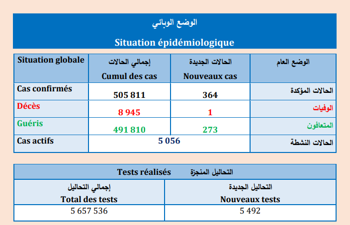 أعلنت وزارة الصحة ، اليوم الأحد ، عن تسجيل 364 حالة إصابة جديدة بفيروس كورونا المستجد و273 حالة شفاء، وحالة وفاة واحدة خلال الـ24 ساعة الماضية. وأبرزت الوزارة، في النشرة اليومية لنتائج الرصد الوبائي لـ(كوفيد-19)، أن عدد المستفيدين من الجرعة الأولى من التلقيح بلغ 4 ملايين و655 ألف و7 أشخاص، لافتة إلى أن عدد المستفيدات والمستفيدين من الجرعة الثانية من التلقيح بلغ 4 ملايين و186 ألف و449 شخصا.