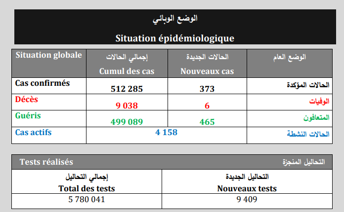 كوفيد-19: تسجيل06 حالة وفاة و 373 إصابة جديدة و 465 حالة شفاء خلال الـ24 ساعة الماضية