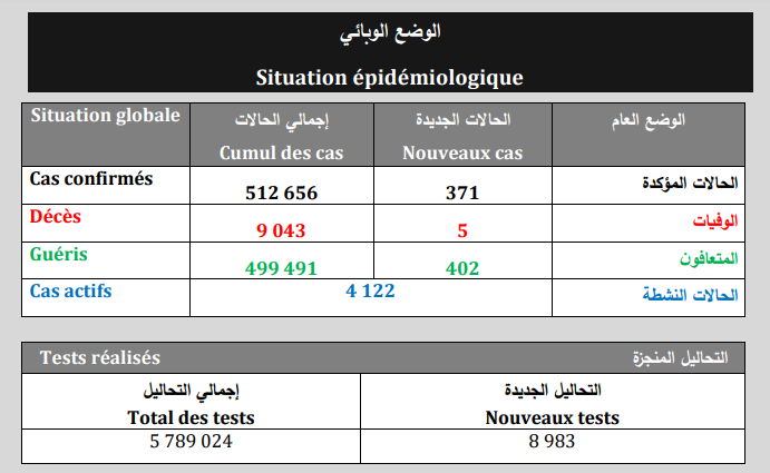 كوفيد-19: تسجيل 05 حالة وفاة و 371 إصابة جديدة و 402 حالة شفاء خلال الـ24 ساعة الماضية