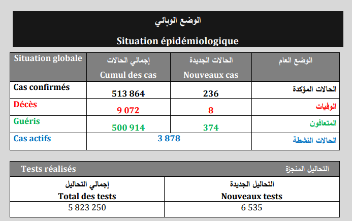 أعلنت وزارة الصحة ، اليوم الأحد ، عن تسجيل 236 حالة إصابة جديدة بفيروس كورونا المستجد و374 حالة شفاء، و8 حالات وفاة خلال الـ24 ساعة الماضية.