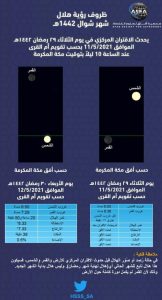 في حين أن هذه الجمعية أوضحت أنه “في يوم الأربعاء المقبل ( 30 رمضان 1442 هجري في السعودية)، فإن فترة مكث الهلال بعد غروب الشمس نحو 39 دقيقة، وعمره يقدر حينها بنحو 21 ساعة، وارتفاعه عن الأفق 7.33 درجة، وإضاءة سطحه 0.6% من إضاءة القمر البدر”، لافتة إلى أنها “فترة كافية لمشاهدته بالعين المجردة في حال كانت الأجواء صافية، والأفق الغربي خاليا من السواتر”.