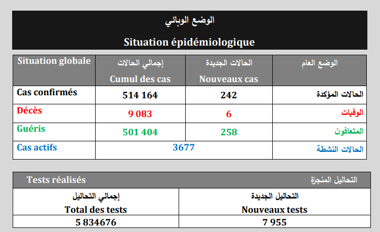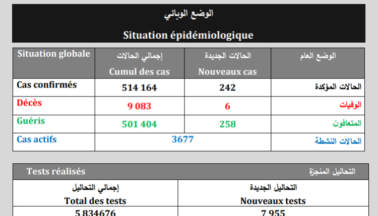 أعلنت وزارة الصحة، اليوم الثلاثاء، عن تسجيل 242 حالة إصابة جديدة بفيروس كورونا المستجد و258 حالة شفاء، و6 حالات وفاة خلال الـ24 ساعة الماضية، فيما بلغ عدد المستفيدين من الجرعة الأولى من التلقيح 5 ملايين و903 ألف و593 شخصا.