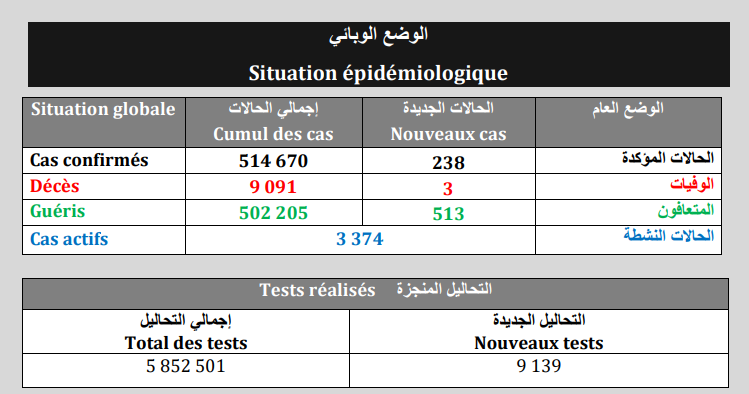أعلنت وزارة الصحة ،اليوم الخميس، عن تسجيل 238 حالة إصابة جديدة بفيروس كورونا المستجد، و513 حالة شفاء خلال ال 24 ساعة الأخيرة .