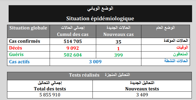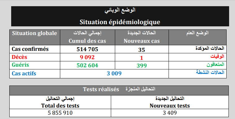 كوفيد-19: تسجيل 01 حالة وفاة و 35 إصابة جديدة و 399 حالة شفاء خلال الـ24 ساعة الماضية