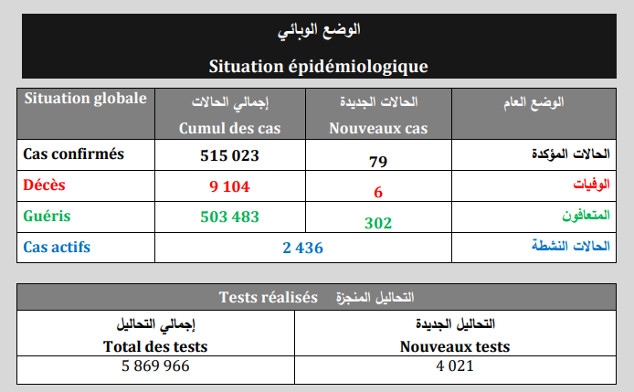 أعلنت وزارة الصحة، اليوم الاثنين، عن تسجيل 79 حالة إصابة جديدة بفيروس كورونا المستجد و302 حالة شفاء، وست حالات وفاة خلال الـ24 ساعة الماضية، فيما بلغ عدد المستفيدين من الجرعة الأولى من التلقيح ستة ملايين و458 ألف و947 شخصا.