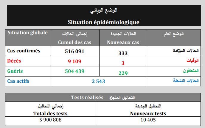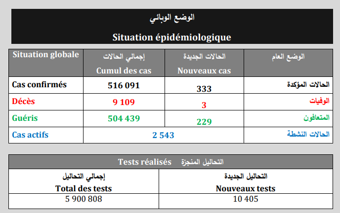 أعلنت وزارة الصحة، اليوم الخميس، عن تسجيل 333 حالة إصابة جديدة بفيروس كورونا المستجد و229 حالة شفاء، وثلاث وفيات خلال الـ24 ساعة الماضية، فيما بلغ عدد المستفيدين من الجرعة الأولى من التلقيح سبعة ملايين و267 ألفا و431 شخصا.